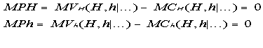 The two graphs of the marginal rules are shown below. The two rules can also be graphed as two equations, MPH(H,h)=0 and MPh(H,h)=0, in H and h, with H on the horizontal axis and MPH steeper in slope than Mph. The equilibrium is given by the intersection of the two functions. For our assumptions and purposes, the joint equilibrium is stable as indicated by the + and - signs in the phase diagram also given below.