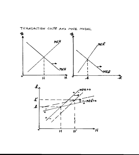 where MPH and MPh are the marginal profit functions set equal to zero and solved jointly for H and h. The marginal values are decreasing in H and h, respectively. The marginal costs are assumed to be constant for simplicity in H and h, respectively, independent of the three parameters, and independent of each other, but interactions could be brought in and economies of scale or diseconomies of scale could be assumed. I further assume that technical complementarity exists for H and h, so that MVH increases when h increases and MVh increases when H increases. The A and R positively affect MVH and MVh. The parameter D is complicated to handle. Essentially, if competition in the industry increases so that D decreases, then MVH and MVh are negatively affected.