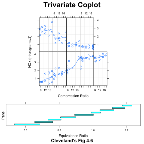 This page illustrates graphical analysis of trivariate data, using figures from Chapter 4 of Visualizing Data, by William Cleveland. Figures were made with ggplot2 (left column) and Lattice (right column). Click on a figure to see the code that made it.